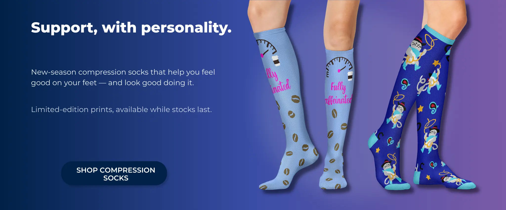 Browse our extensive range of fun compression socks. Fashion prints and solid colours available.