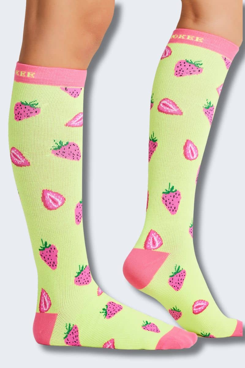 Enjoy style and comfort with the Cherokee Women's Support Socks in the charming Strawberry Patch print. These knee-high compression socks offer graduated 10-15 mmHg compression to help support healthy circulation, making them a great choice for long shifts or busy days. Crafted with a soft, lightweight fabric blend, these socks ensure all-day comfort and durability. Made in the USA they're both functional and fun to wear!
