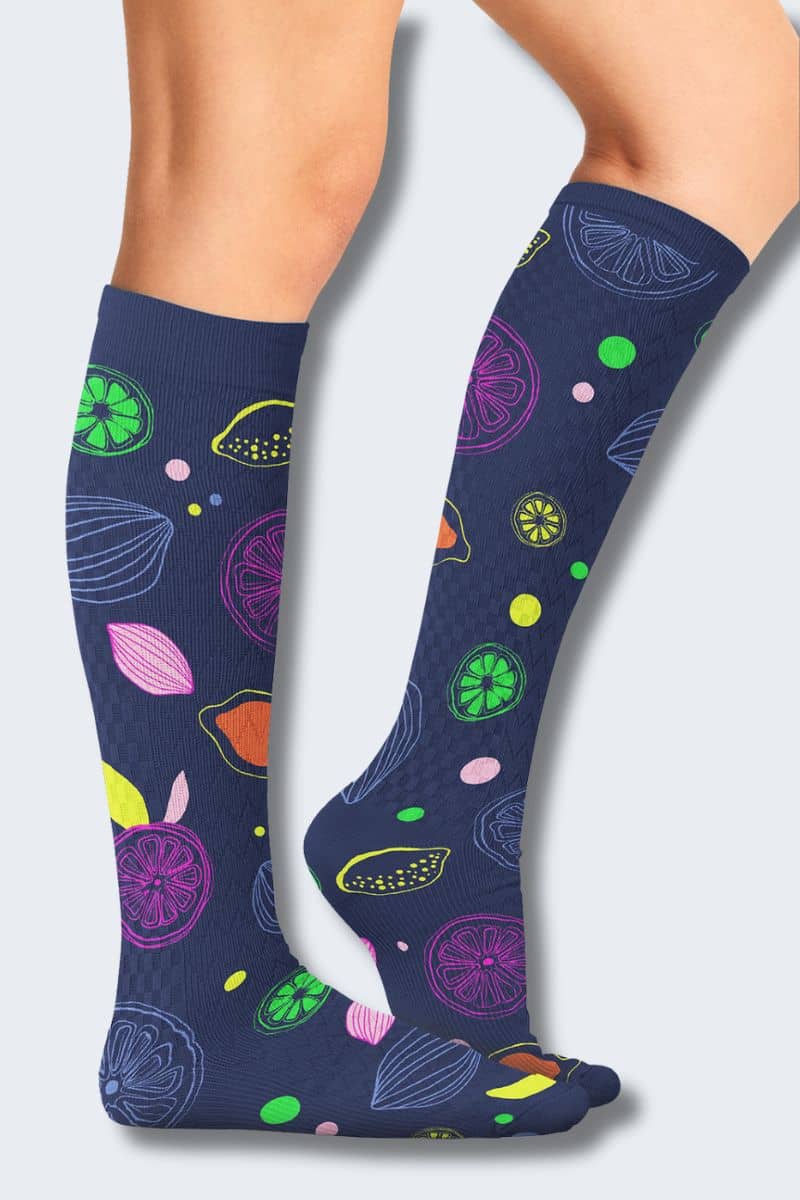 Juicy style. Zesty support. Add a burst of colour to your shift with the Tutti Frutti knee-highs - a sweet treat for your feet. With cheerful fruit-inspired prints and gentle compression to energise your legs, these socks bring serious fun to function. Lightweight, breathable, and USA-made, they're your go-to pick for comfort with a twist of bold.