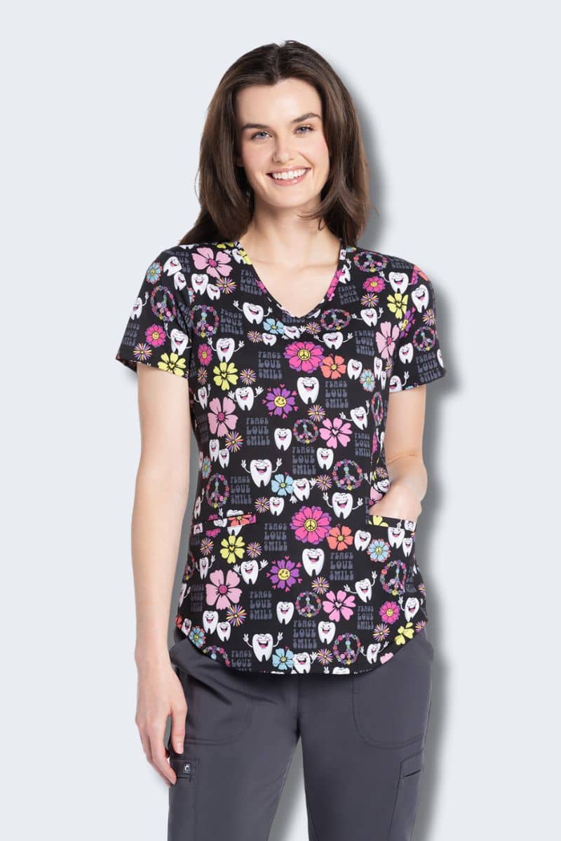 Spreading good vibes, one smile at a time! This Modern Classic fit scrub top is all about retro peace signs, happy teeth, and colourful florals, making it an instant mood booster. Designed with a shirttail hem and two half-welt front pockets, it's perfect for storing your essentials while keeping you comfy and stylish.