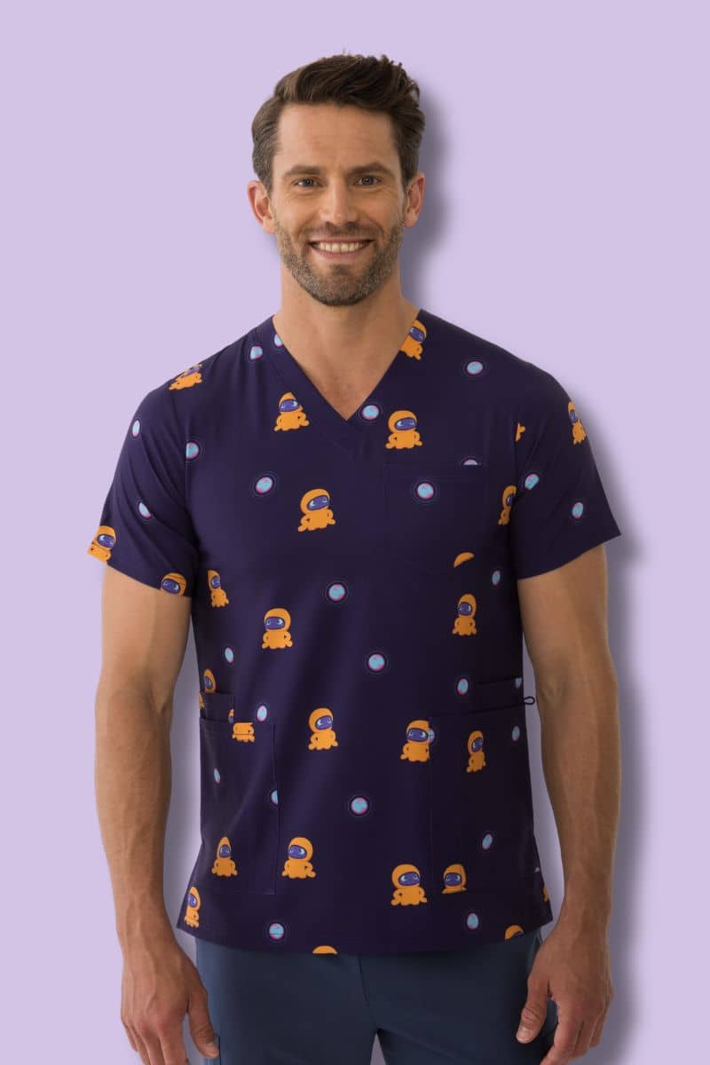 Why healthcare workers love this top: The Blip print features Blip's signature character — an adorable orange space creature — scattered across a deep navy base. It's fun without being loud, making it perfect for paediatric wards, children's clinics, dental practices, and anywhere a smile makes a difference.