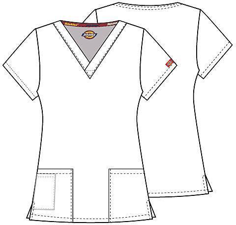 Description: A Modern Classic Fit (allows for women's natural curves), V-neck scrubs top features Dickies logo twill tape at the back neck, patch pockets, a stretchy red knit interior pocket and side vents. Centre back length: 27".