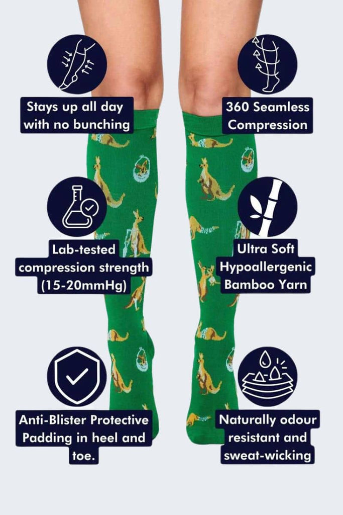Emergency Room? More like Emergency Roo! The Kangaroo Hospital Bamboo Compression Socks by Dr Woof add a little Aussie flair to your workday while providing unparalleled comfort and support. Crafted with buttery-soft bamboo fabric and 360° seamless medium graduated compression (15-20 mmHg), these socks are perfect for keeping your feet energised and ache-free.