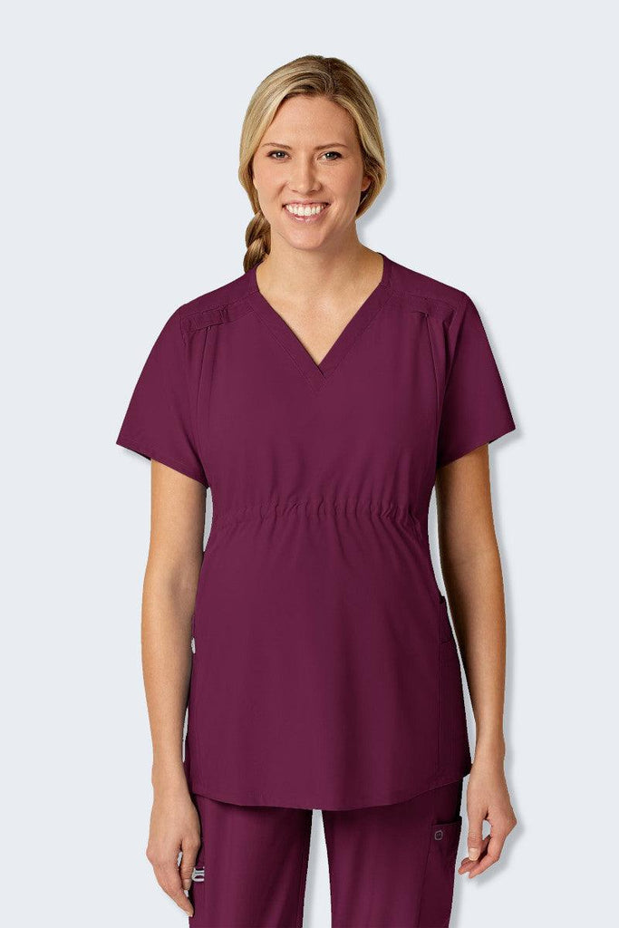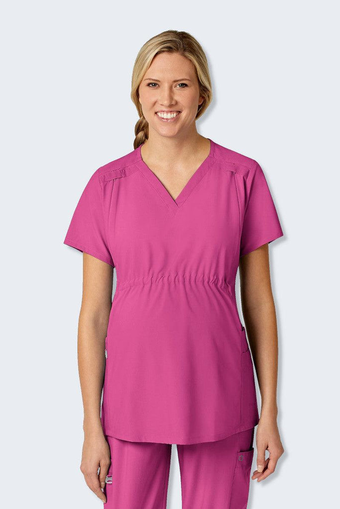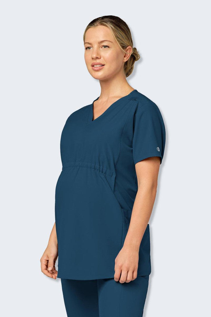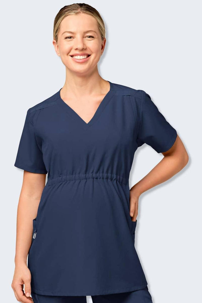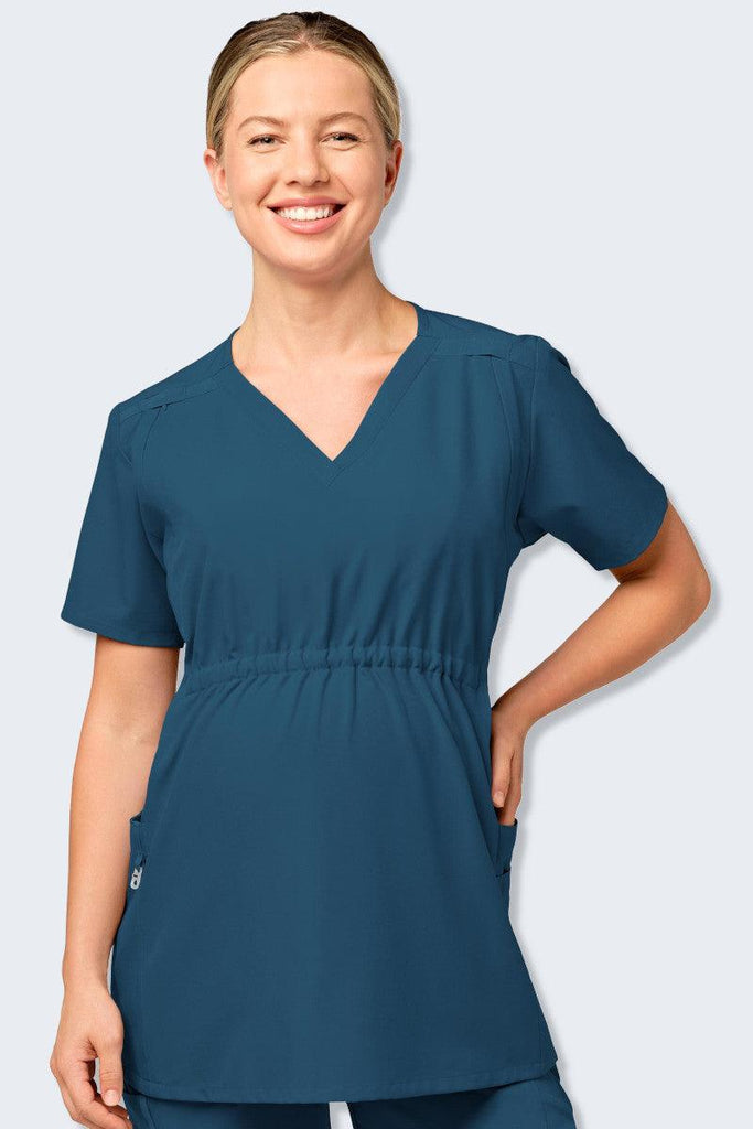 Wink is back with a fantastic maternity scrub top that features so many comforts and conveniences you will want to wear it even when you’re not pregnant. Just try to pick a favourite feature on this v-neck maternity top! Yes, there are convenient pockets, including our “no-budge” cell phone pocket, a pen slot, and three top-loading pockets (one layered) on the side panels. There are three options to clip your badge; choose from one of the dyed-to-match grosgrain badge loops along either the shoulder yoke or the Wink logo silicone D-ring. The adjustable elastic empire centre seam has interior comfort elastic pulls so you can cinch and expand the waistline as you grow and shrink after birth. The postnatal nursing zippers are a game changer in a maternity top. The zippers are hidden along the front, Princess seams, but offer easy access for nursing or pumping convenience once you get back to work after the baby arrives. Remember that the microfiber polyester 4-way stretch fabric is the ultimate comfort and durability, so you are not sacrificing any comfort for this extra convenience.