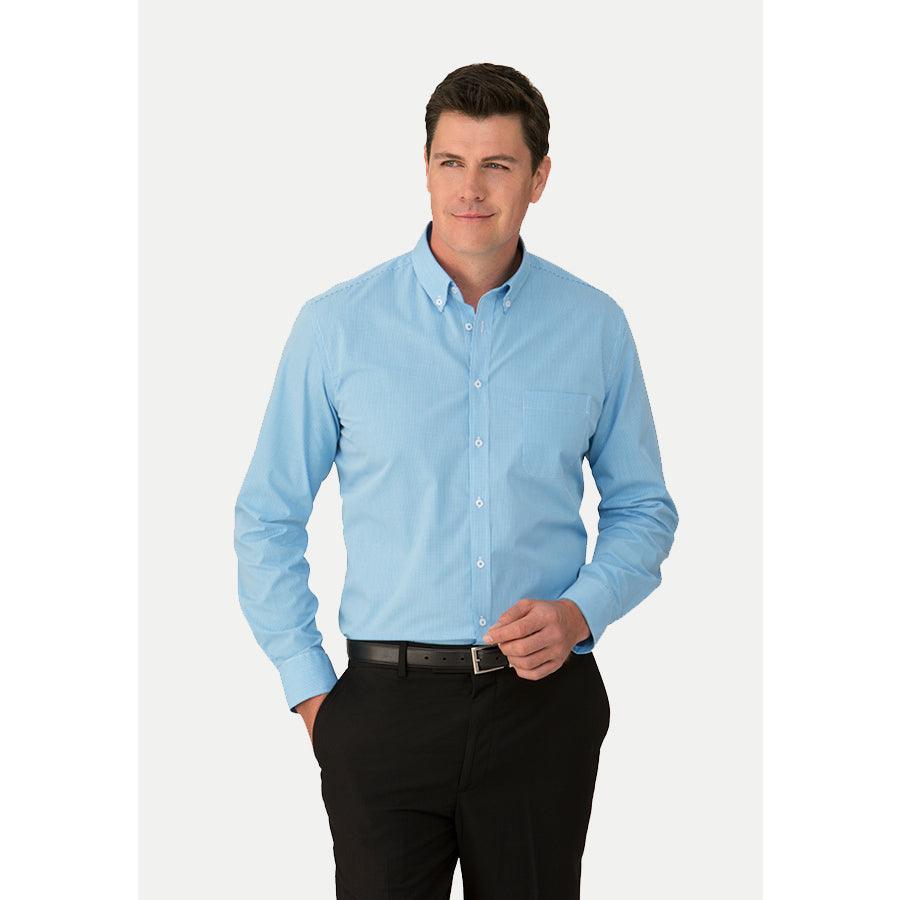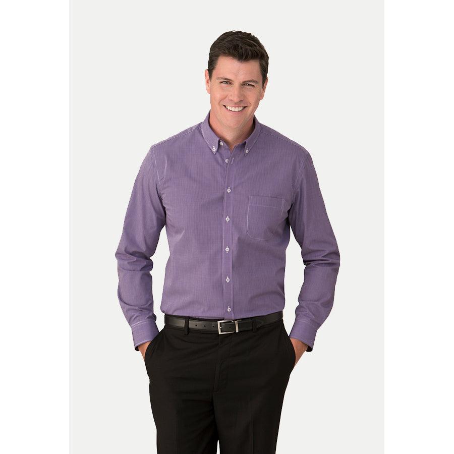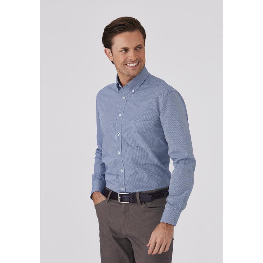This style has a button-down collar and a 2-button adjustable cuff with contrast trim on the inside collar and cuffs. Also features easy-care cotton-rich fabric.