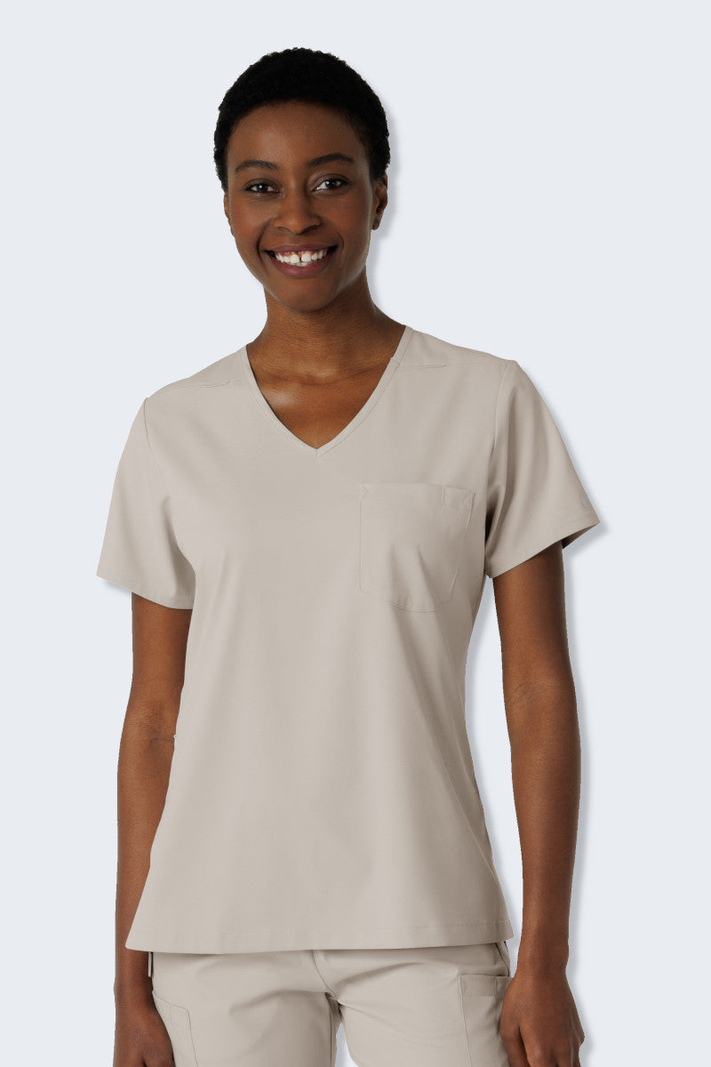 This women's tuck-in scrub top combines a softly curved V-neck with a stylish high-to-low hem, offering a flattering and modern fit. It is designed with practicality in mind and features multiple pockets, including a chest pocket with a bartack stitch for your pen and a secure back card pocket with a zipper to keep small items safe. Dual badge loops on the shoulders provide flexibility for your badge placement. The modern fit allows for ease of movement without feeling too loose or baggy, while side hem vents enhance your range of motion, making it easy to navigate your shift. This top offers versatility and comfort, whether you tuck it into your favourite scrub pants or let it drape naturally. Crafted from a super soft, stretchy, and sustainably sourced fabric, it feels great to wear and supports eco-friendly practices—so you can care for your patients while contributing to the planet's well-being.