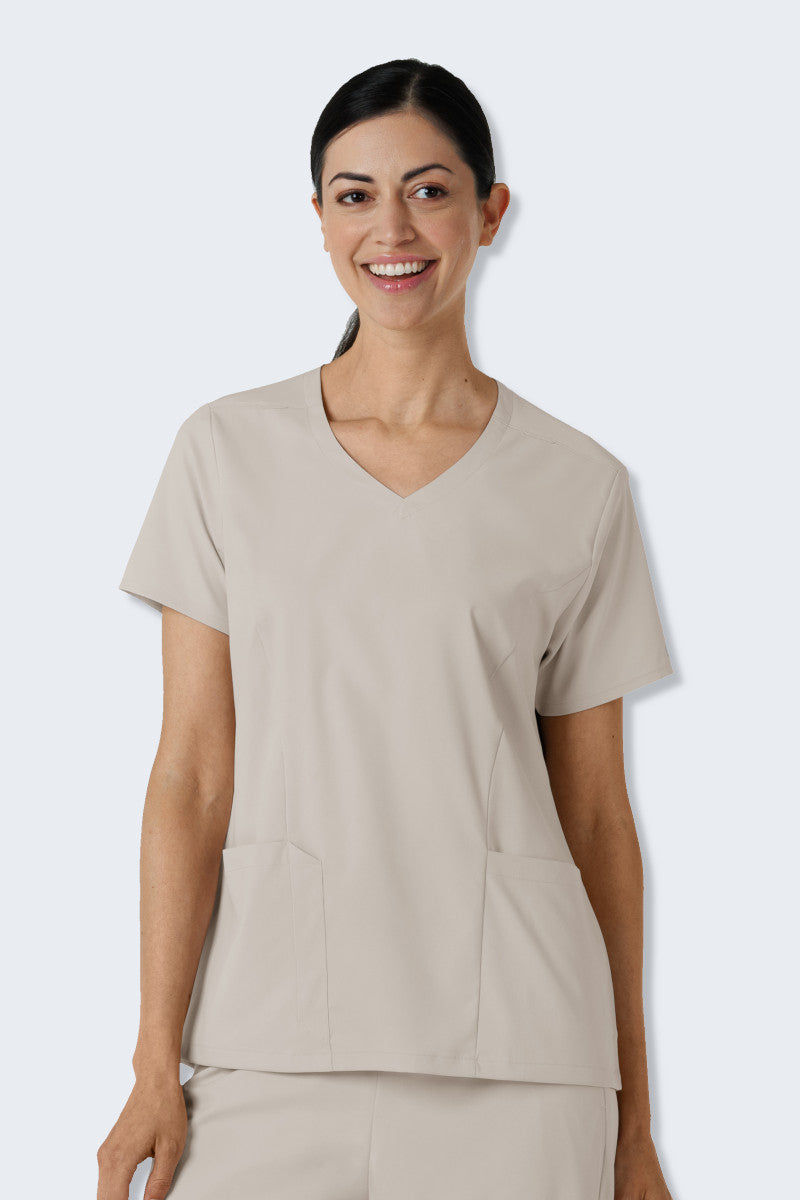 Power through busy shifts and back-to-back appointments easily in this women's V-neck scrub top. Featuring a classic neckline and a relaxed drape, it offers the perfect blend of comfort and efficiency to keep your day running smoothly. Thoughtfully designed pockets ensure your essentials are always within reach, with dedicated spaces for your pen and phone for added convenience. The gently curved hemline creates a sleek, modern silhouette, making this top a go-to favourite for work. Crafted from soft, stretchy, and sustainably sourced fabric, it provides a comfortable fit that’s neither tight nor loose. Dual badge loops on the shoulders allow you to choose the most convenient placement. With a perfect mix of functionality and style, this scrub top is your reliable companion for confidently tackling every task.