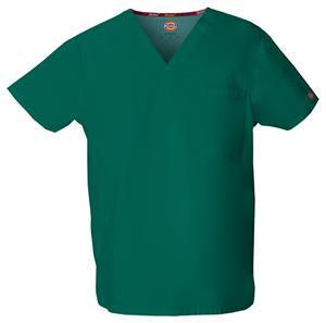 Description: A Unisex V-neck top features Dickies logo twill tape at the back neck, a front chest pocket with a bar tacked pencil slot and side vents. Centre back length: 28".